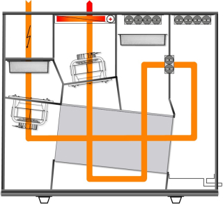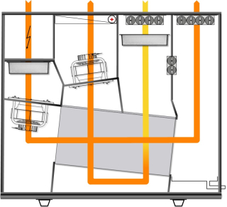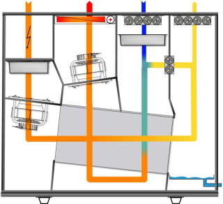 Осушение воздуха осуществляется в регулируемом режиме приточно-вытяжной вентиляции с подачей свежего и утилизацией части отработанного воздуха. Многократное осушение воздуха происходит путем охлаждения воздуха из плавательного бассейна в блоке пластинчатого рекуператора. Смешивание с более холодным приточным воздухом улучшает охлаждающий эффект в блоке пластинчатого рекуператора и значительно увеличивает осушение воздуха. В холодные месяцы открытие клапанов приточного / вытяжного воздуха регулируется в пределах от 20 до 99%.