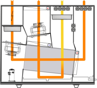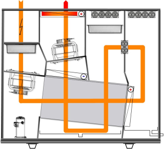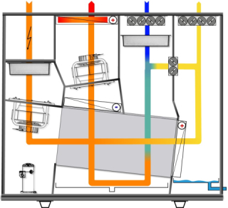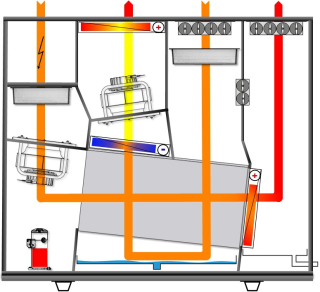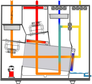 При высоких температурах наружного воздуха для осушения используется режим 100 % вентиляции приточного / вытяжного воздуха с тепловым насосом. Осушение воздуха происходит путем охлаждения на испарителе теплового насоса. Если температура поступающего воздуха еще не достигла заданного значения, установленного на пульте управления, она повышается до требуемого уровня с помощью водяного калорифера.