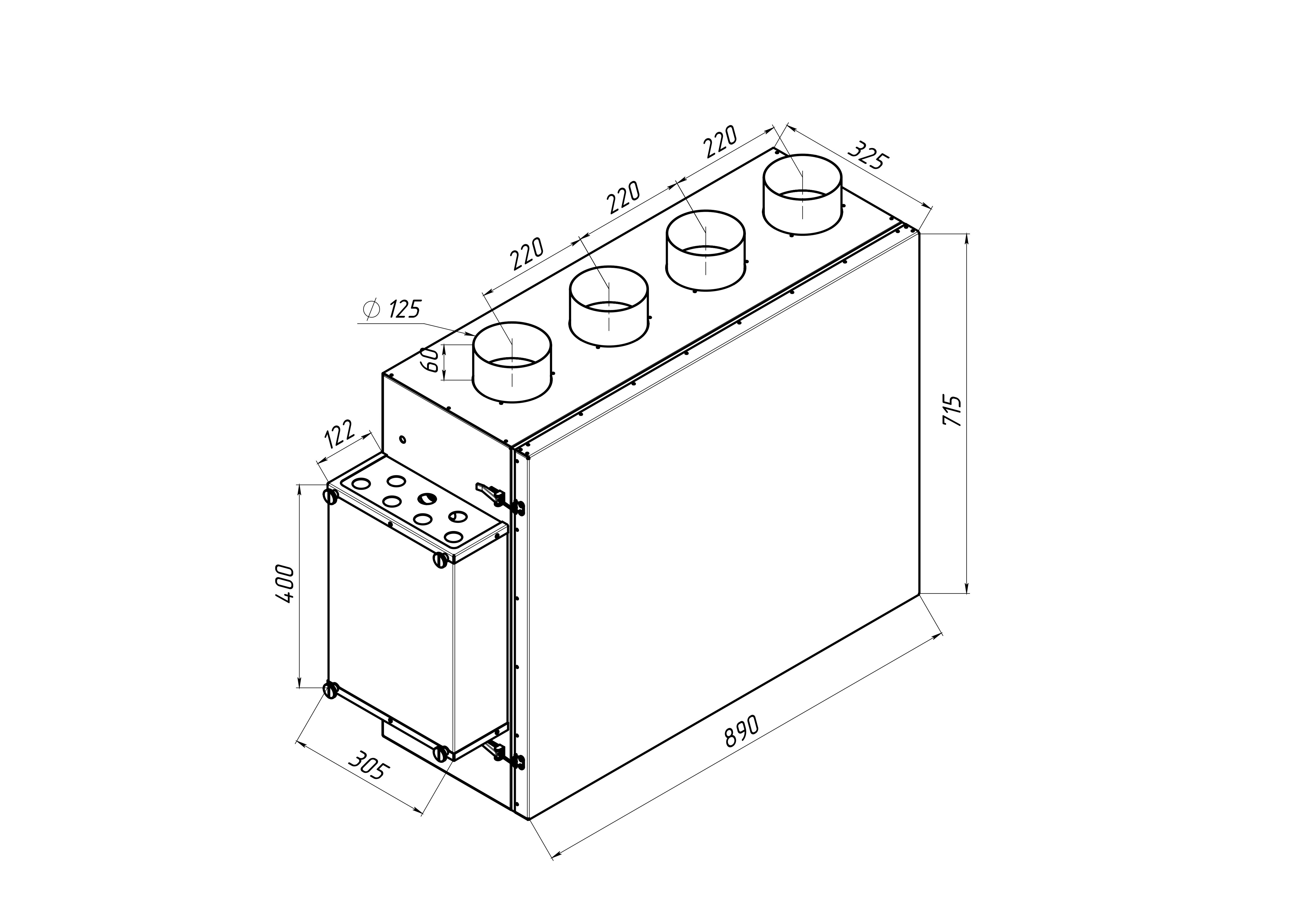 Установка работает практически бесшумно – уровень шума сравним с работой ноутбука. Благодаря компактным габаритам и удобному монтажу, её можно установить в мебель, на стену, потолок или пол. Все воздуховоды подключаются сверху, что упрощает установку и интеграцию в интерьер.